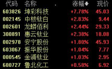 万联证券表示, 在外贸出口市场利好下,国内中信钛业、安纳达、龙蟒佰利等20多家生产商集中宣涨,钛白粉整体调价幅度在800-1500元/吨之间,且部分国内生产商已接单到5月,供应端现货紧张,实单成交一单一议。上游原材方面,攀西地区钛精矿价格坚挺上行,钛矿货源紧张,矿商惜售情绪明显,助推钛白粉价格上涨。现阶段,国内钛白粉市场在利好刺激下,挺价心态不减,预计近期钛白粉价格将高位运行,建议关注市场成单情况及相关龙头企业开工动态。