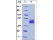 The protein has a calculated MW of 15.4 kDa. The protein migrates as 29-35 kDa when calibrated against Star Ribbon Pre-stained Protein Marker under reducing (R) condition (SDS-PAGE) due to glycosylation.