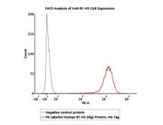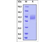 The protein has a calculated MW of 50.3 kDa. The protein migrates as 65-80 kDa when calibrated against Star Ribbon Pre-stained Protein Marker under reducing (R) condition (SDS-PAGE) due to glycosylation.