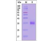 The protein has a calculated MW of 24.8 kDa. The protein migrates as 35-43 kDa under reducing (R) condition (SDS-PAGE) due to glycosylation.