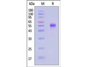 The protein has a calculated MW of 47.2 kDa. The protein migrates as 55-65 kDa when calibrated against Star Ribbon Pre-stained Protein Marker under reducing (R) condition (SDS-PAGE) due to glycosylation.
