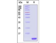 The protein has a calculated MW of 36.3 kDa and 13.9 kDa. The protein migrates as 40-42 kDa and 15 kDa under reducing (R) condition (SDS-PAGE) due to glycosylation.