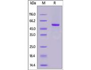 The protein has a calculated MW of 41.8 kDa. The protein migrates as 45-55 kDa under reducing (R) condition (SDS-PAGE) due to glycosylation.