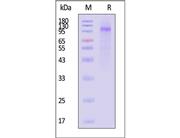 The protein has a calculated MW of 27.9 kDa. The protein migrates as 36-50 kDa when calibrated against Star Ribbon Pre-stained Protein Marker under reducing (R) condition (SDS-PAGE) due to glycosylation.
