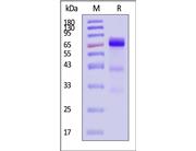 The protein has a calculated MW of 58.0 kDa. The protein migrates as 60 kDa when calibrated against Star Ribbon Pre-stained Protein Marker under reducing (R) condition (SDS-PAGE) due to glycosylation.