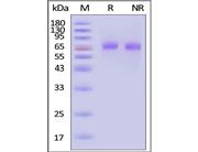 The protein has a calculated MW of 54.4 kDa. The protein migrates as 60-66 kDa when calibrated against Star Ribbon Pre-stained Protein Marker under reducing (R) condition (SDS-PAGE) due to glycosylation.