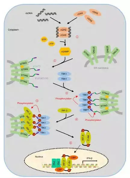 cGAS-STING通路招募和激活TBK1与IRF-3示意图https://doi.org/10.1038/s41586-019-1228-x
