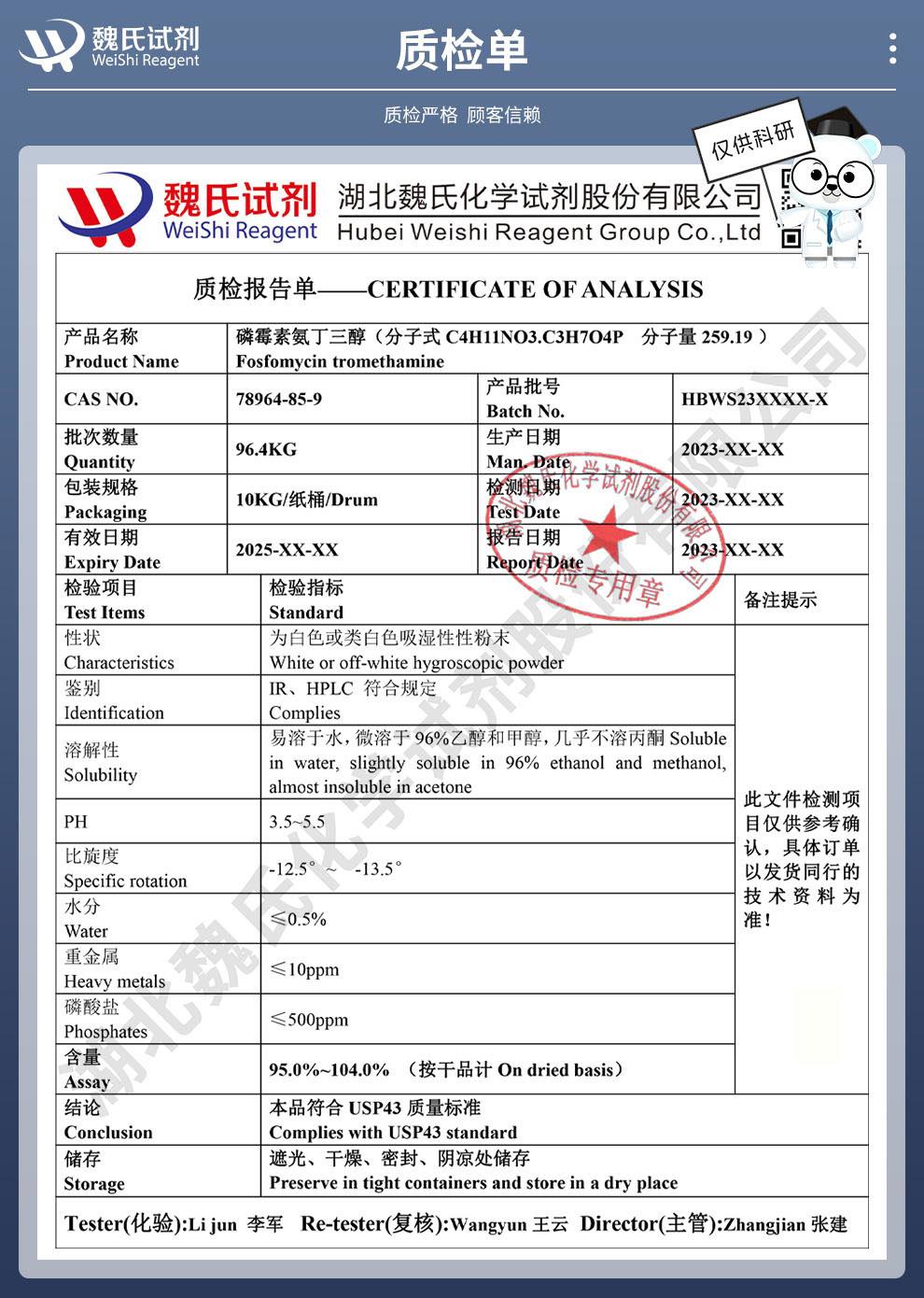 魏氏化学试剂采用ERP系统和试剂商城,为国内外科研机构客户提供及时完善的产品技术服务。公司奉行以“质量为生命,科技为先导,创新求生存,诚信为本”的企业宗旨,坚持“团结拼搏,追求卓越,精益求精,合作发展”的企业理念,诚挚与国内外同仁精诚合作,互利互惠,携手共赢。