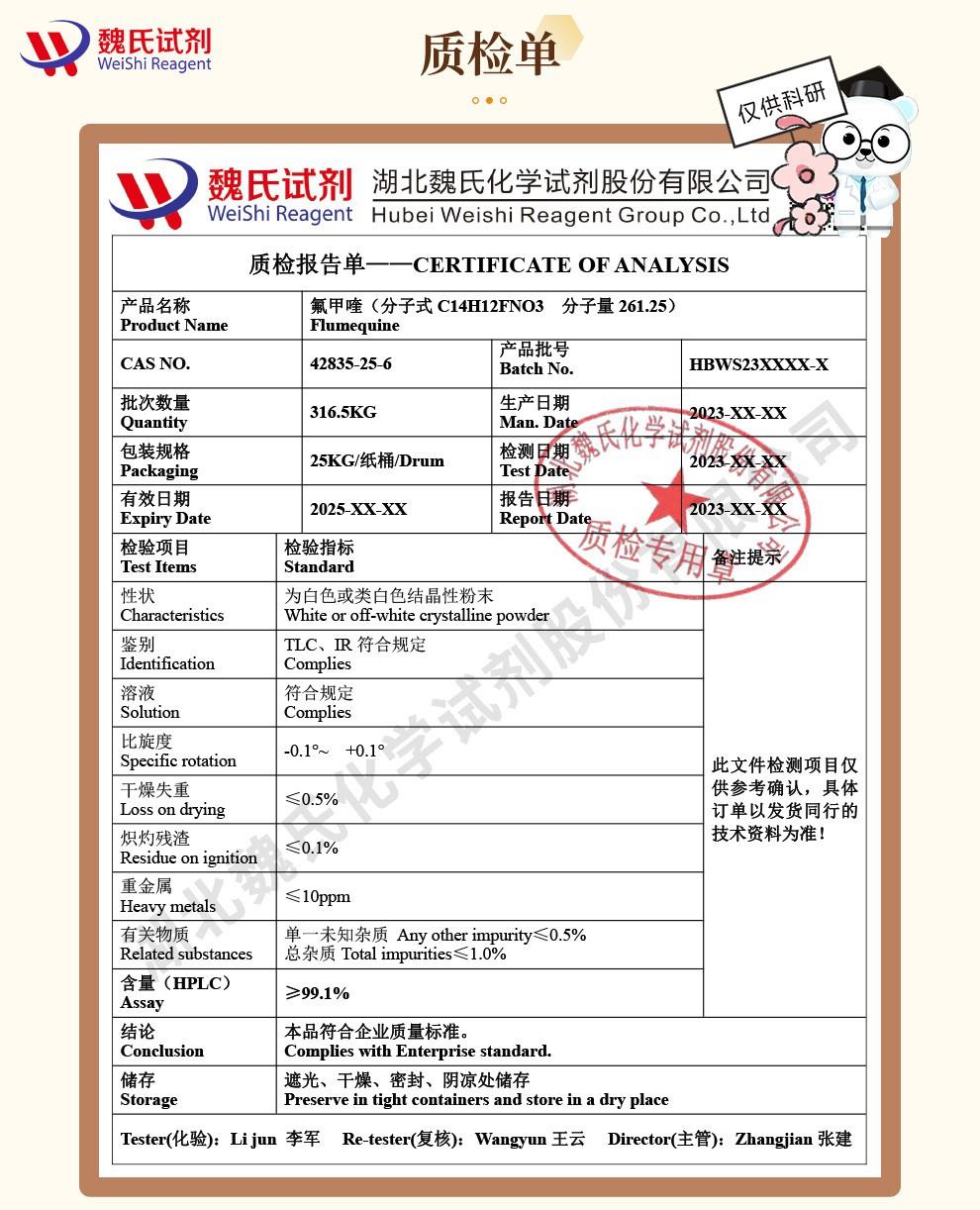- 42835-25-6氟甲喹;纯度≥98.0%;湖北研科时代科技-“研”无止境;“科”学创新!支持三方验证;支持定制;检测图谱;MSDS等技术支持!