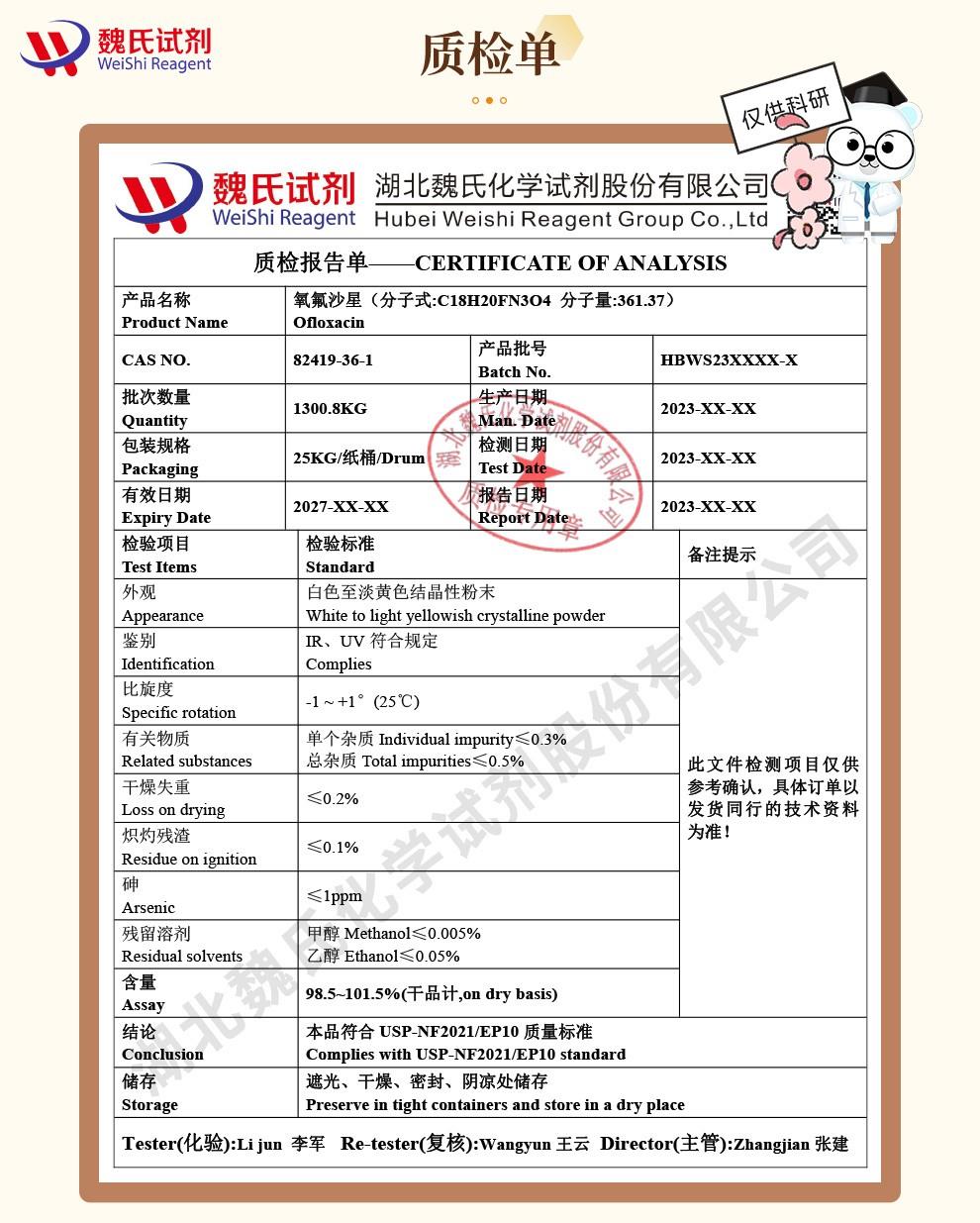 - 基体/鱼肉中氧氟沙星/GB/T 20366-2006、GB/T 21312-2007、农业部1077号公告-1-2008,82419-36-1