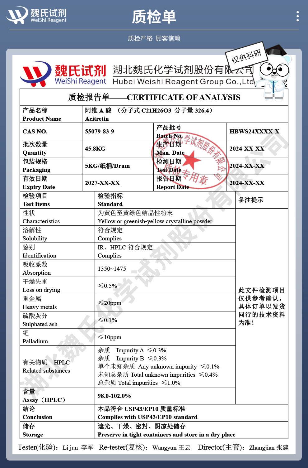 - 阿维A酸 55079-83-9 USP/EP出口品质 含量 ≥99%