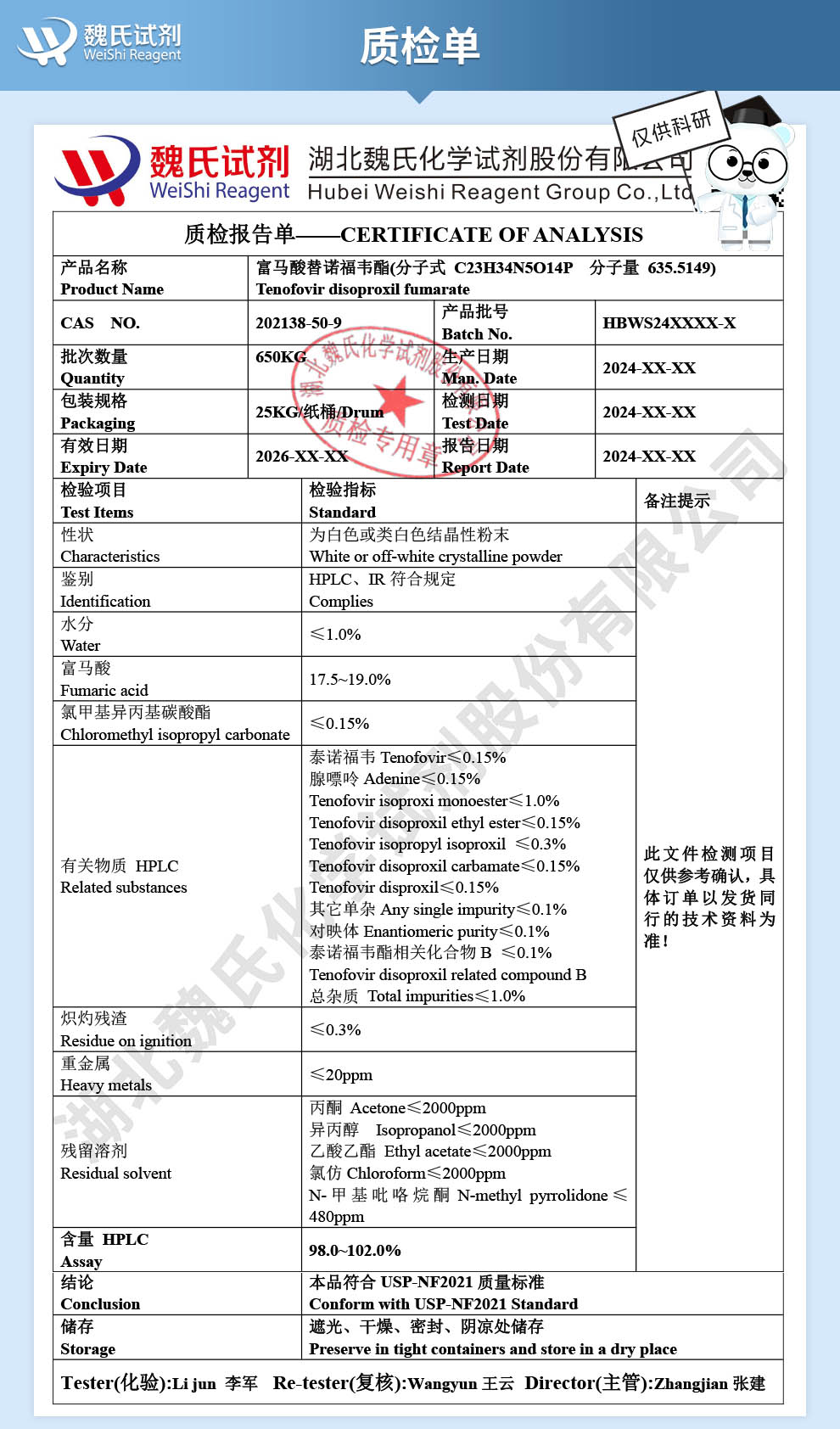 - 202138-50-9富马酸替诺福韦酯 98% 武汉鼎信通药业 丁亮 15871722230