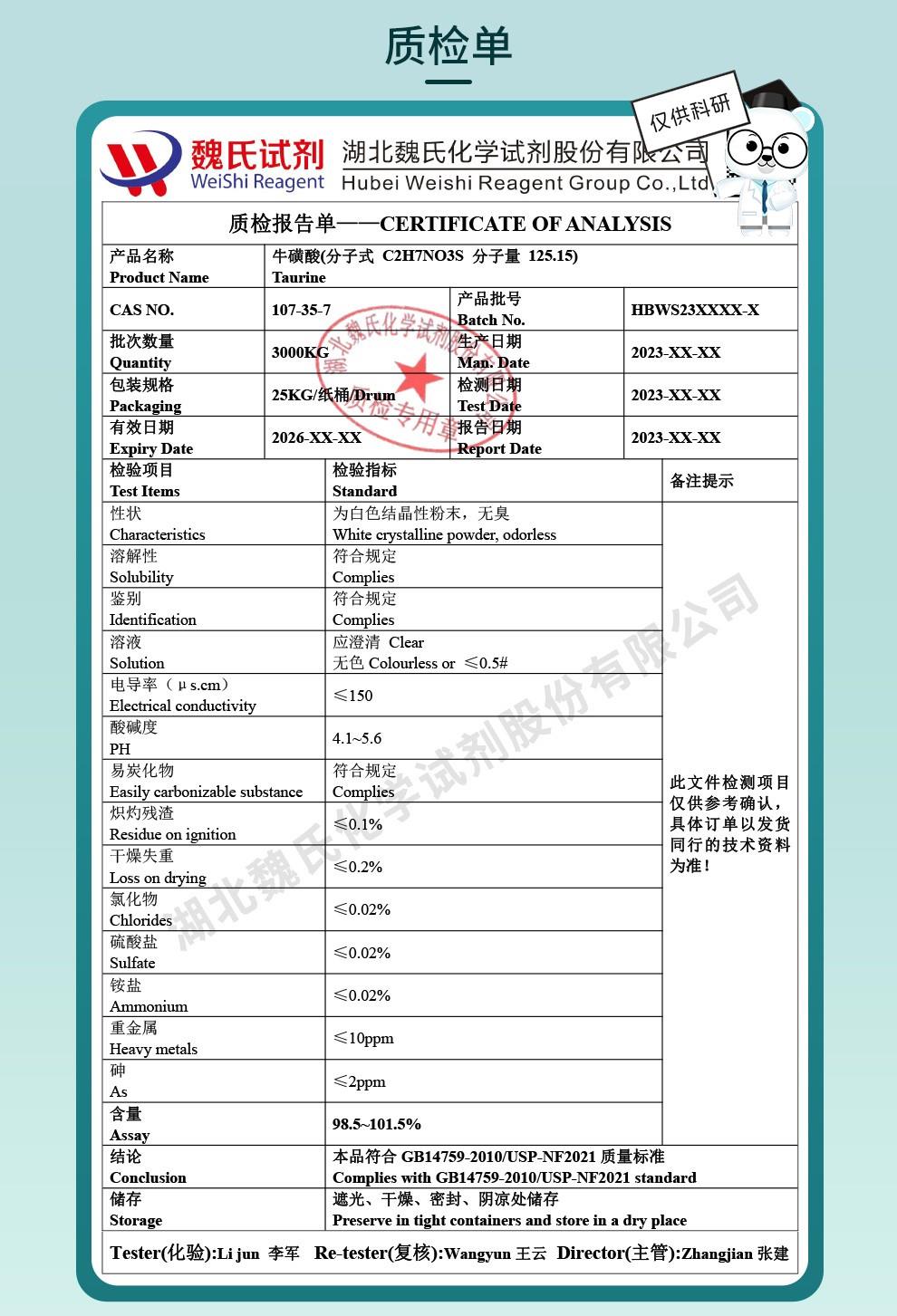 - 牛磺酸(药用辅料),含量98.5,库存充足,符合药典四部,有质检单,营业执照