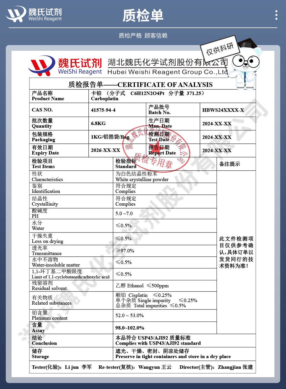 - 卡铂;USP/EP药典标准;含量99%;出口级