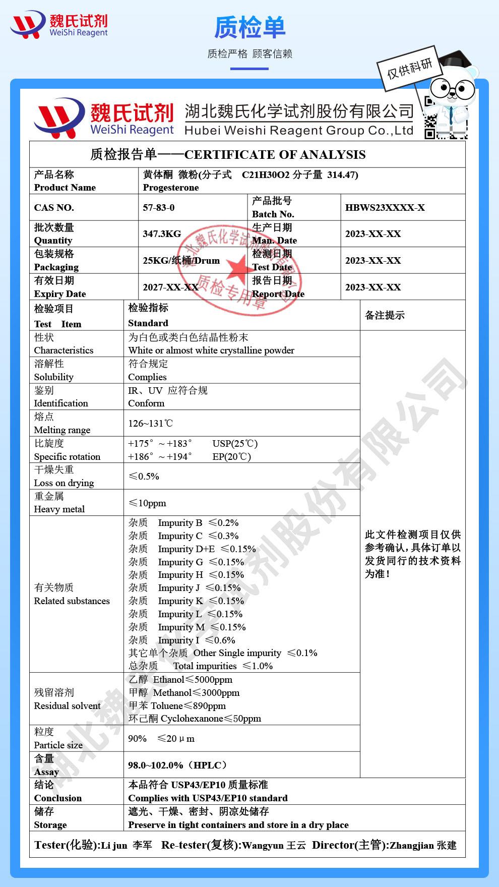 - 黄体酮;黄体素;孕酮;激孕酮 ;助孕素 57-83-0 湖北威德利