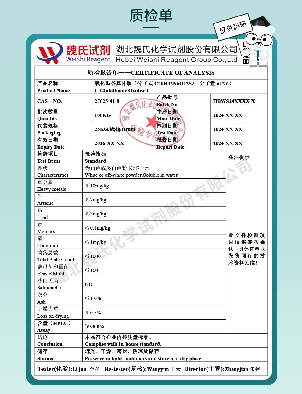 - 27025-41-8 氧化型谷胱甘肽 —检测方法 -技术资料 -生化试剂 -质量标准 -性质 -鼎信通李杰
