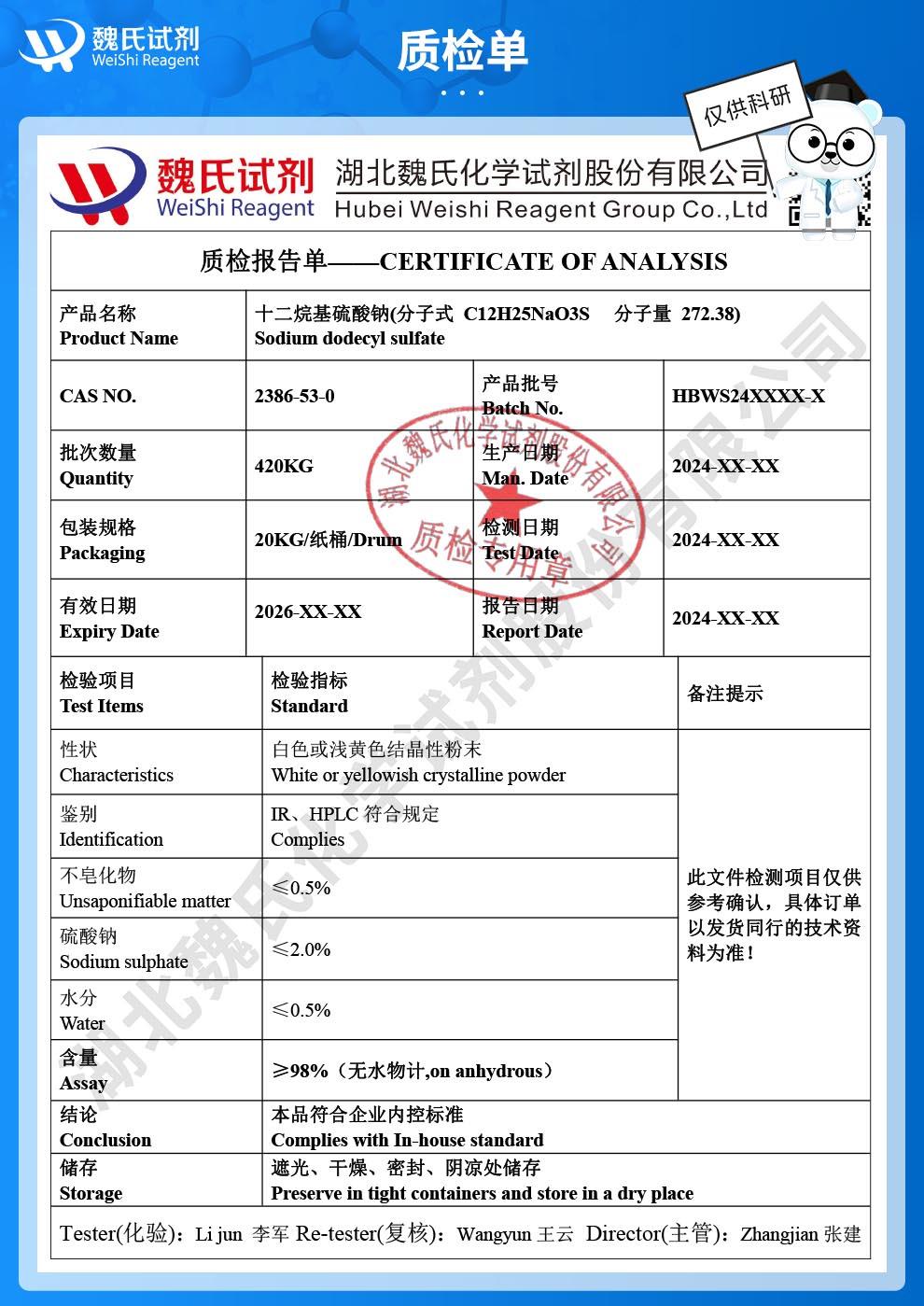 - 十二烷基磺酸钠含量99工业级阴离子表面活性剂乳化剂2386-53-0