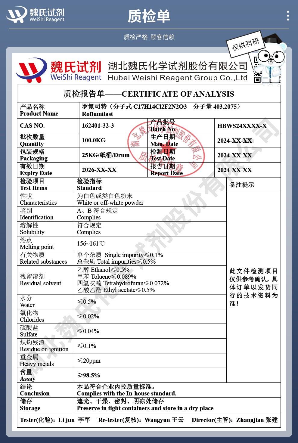 - 罗氟司特,罗氟斯特,162401-32-3,高纯度药品申报标准,含量99%