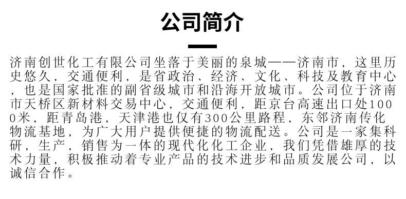 济南创世化工有限公司坐落于美丽的泉城——济南市,这里历史悠久,交通便利,是省政治、经济、文化、科技及教育中心,也是国家批准的副省级城市和沿海开放城市。公司位于济南市天桥区新材料交易中心,交通便利,距京台高速出口处1000米,距青岛港,天津港也仅有300公里路程,东邻济南传化物流基地,为广大用户提供便捷的物流配送。公司是一家集科研,生产,销售为一体的现代化化工企业,我们凭借雄厚的技术力量,积极推动着专业产品的技术进步和品质发展公司,以诚信合作。