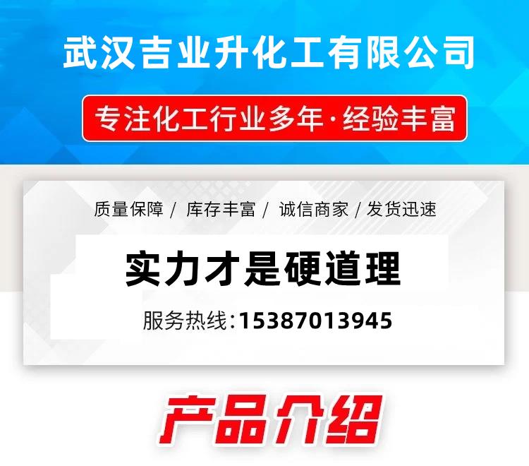 武汉吉业升化工有限公司位于武汉市黄陂区盘龙城经济开发区,专业从事无机化工、有机化工、香精香料、食品添加剂、精细化工。公司产品大量销往湖北、湖南、江西、安徽、河南、河北、江苏、云南、广东、广西、上海。为了更好的为广大客户服务,公司设有专门的售后服务部,您对产品有任何的疑问,我们都会为您细心解答。
