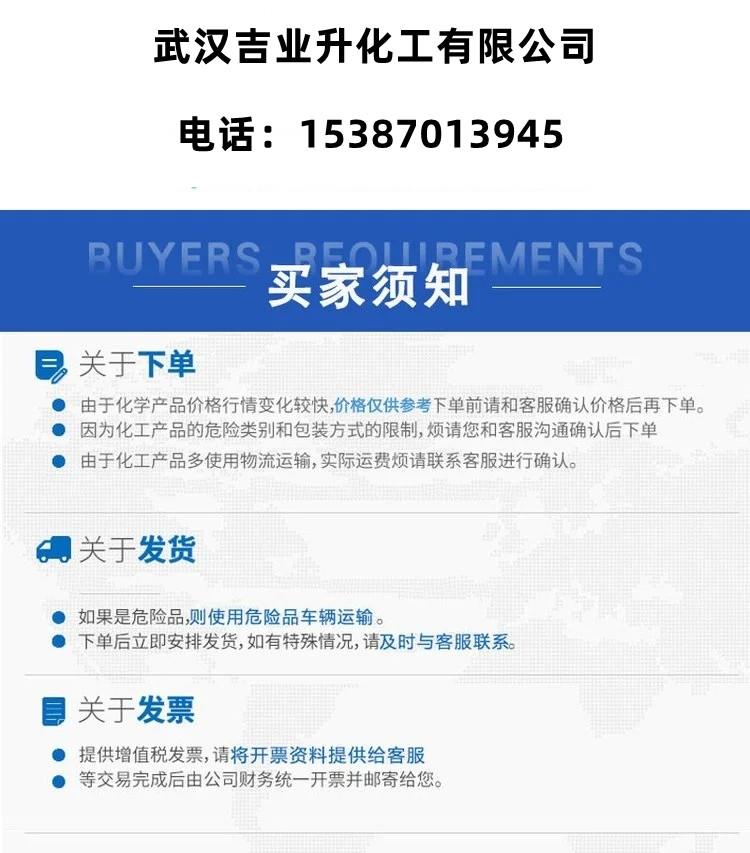 武汉吉业升化工有限公司位于武汉市黄陂区盘龙城经济开发区,专业从事无机化工、有机化工、香精香料、食品添加剂、精细化工。公司产品大量销往湖北、湖南、江西、安徽、河南、河北、江苏、云南、广东、广西、上海。为了更好的为广大客户服务,公司设有专门的售后服务部,您对产品有任何的疑问,我们都会为您细心解答。