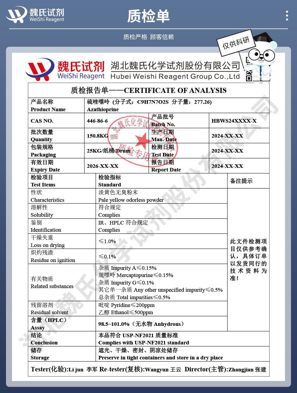 - 硫唑嘌呤 446-86-6 维斯尔曼生物出口|科研|检测方法