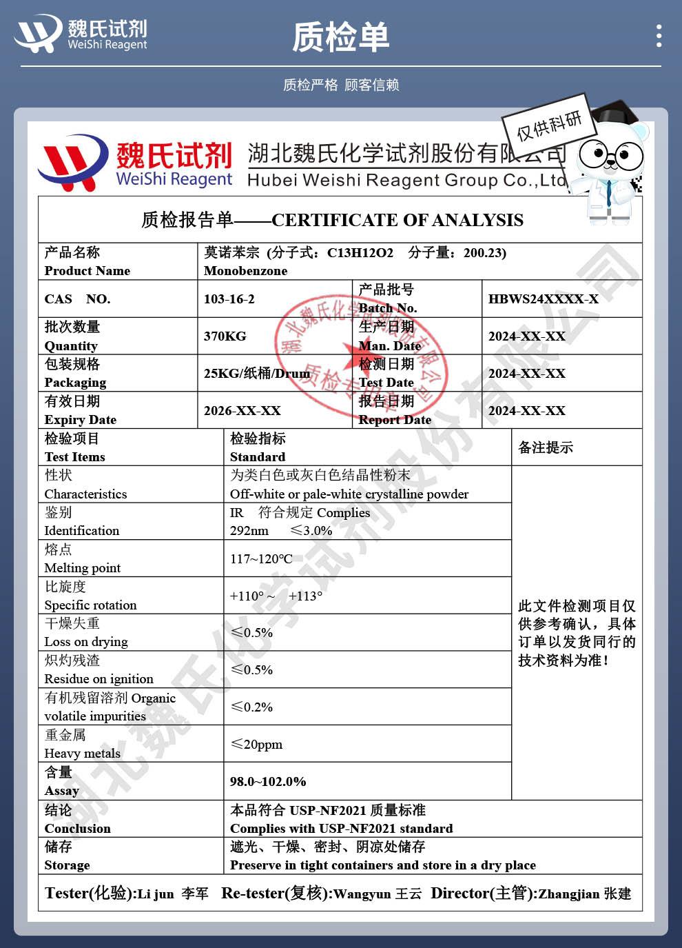 魏氏化学试剂采用ERP系统和试剂商城,为国内外科研机构客户提供及时完善的产品技术服务。公司奉行以“质量为生命,科技为先导,创新求生存,诚信为本”的企业宗旨,坚持“团结拼搏,追求卓越,精益求精,合作发展”的企业理念,诚挚与国内外同仁精诚合作,互利互惠,携手共赢。