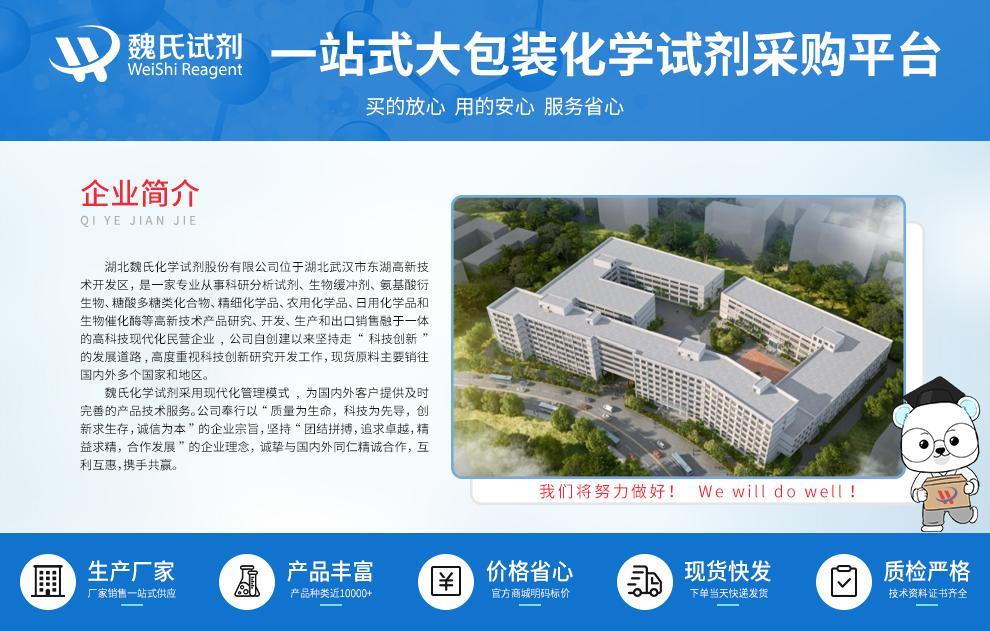 湖北魏氏化学试剂股份有限公司位于湖北武汉市,是一家专业从事科研化学试剂 、生物化工原材料、精细化工和日用化学品?等高新技术产品?研究开发和外贸出口销售融于一体的高科技现代化民营企业。