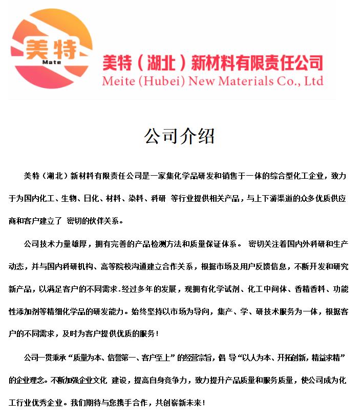 美特(湖北)新材料有限公司是一家集研发、销售于一体的现代化工新材料企业,总部位于湖北省,依托区域资源优势及产业配套能力,专注于化工原料及中间体原料领域的创新发展。公司以技术驱动为核心,致力于为医药、农药、染料、电子化学品及高分子材料等行业提供高品质的化学产品与定制化解决方案。