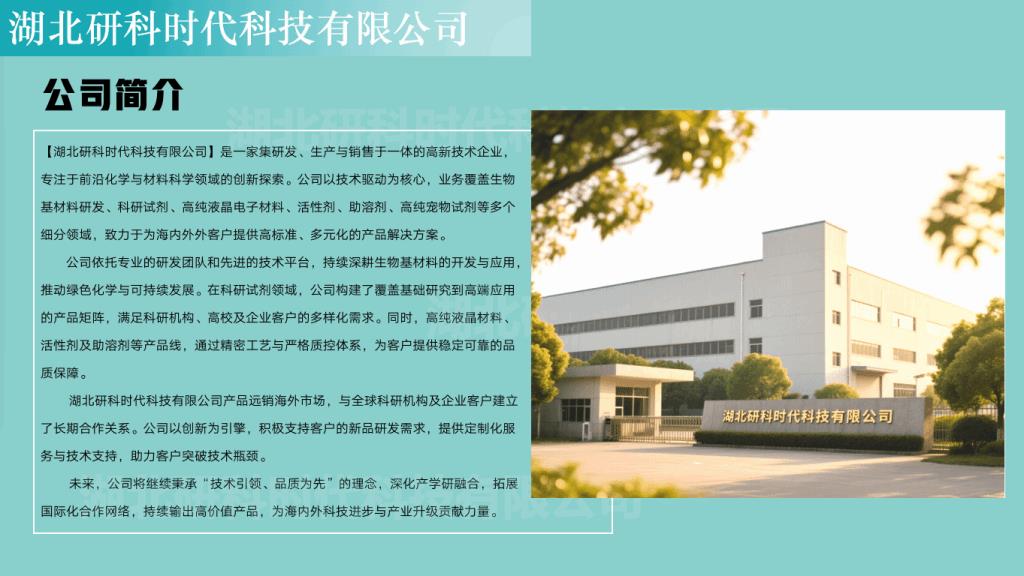湖北研科时代科技有限公司是一家集研发、生产与销售于一体的高新技术企业,专注于前沿化学与材料科学领域的创新探索。公司以技术驱动为核心,业务覆盖生物基材料研发、科研试剂、高纯液晶材料、活性剂、助溶剂、高纯宠物试剂等多个细分领域,致力于为全球客户提供高标准、多元化的产品解决方案。
